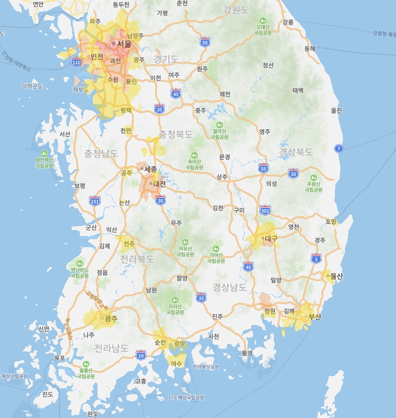 지도상으로 노란색 부분이 조정지역이고 주황색은 투기과열지구, 빨간색은 투기지역이니 편하게 확인하시기 바랍니다. 많은 분들의 관심이 쏟아지고 있는 수도권의 경우에는 투기지역, 투기과열지구, 조정지역이 혼재하고 있으니 더 넓은 지도를 준비했습니다.