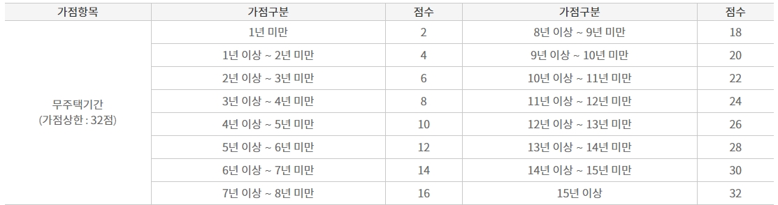 무주택 기간의 따른 가점 배정은 2점 부터 최대 32점 까지 이며 그 내용은 아래와 같습니다.