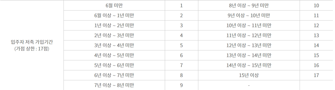 청약통장 가입일에 따른 청약 가점은 1점에서 최대 17점 까지 이며 부모님이 어렸을때 부터 청약통장을 만들어 가지고 있었다면 최고 점수 17점은 쉽게 달성할수 있기 때문에 가장 쉽게 청약가점을 올릴수 있는 방법이기도 합니다.
