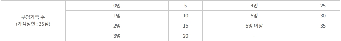 부양가족 수에 따른 가점계산의 예로는 만약 아이3인 부부가 부모님을 모시고 산다고 가정했을때 부양가족의 수는 총 가족 7명중 본인을 제외한 6명으로 35점의 가점을 부여 받을수 있습니다.