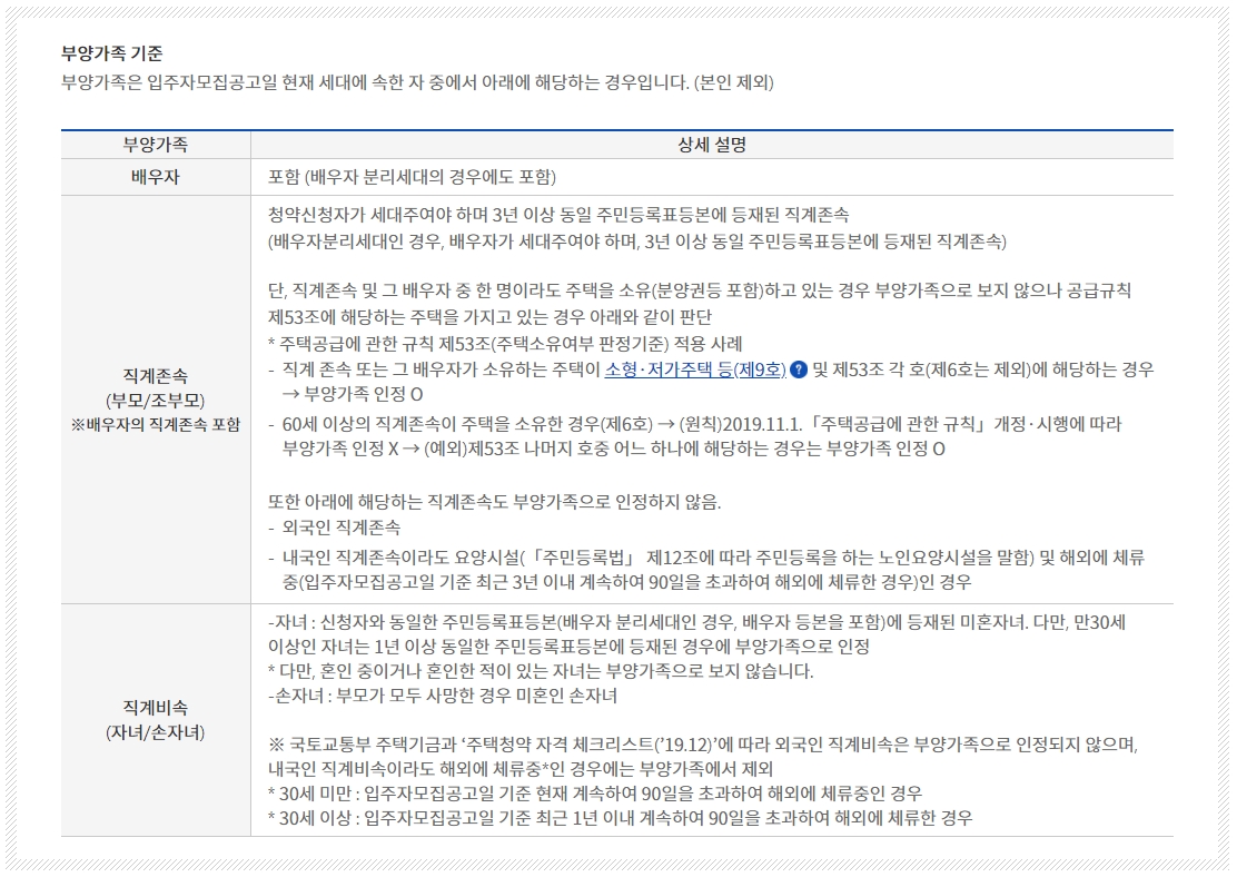 부양가족의 기준은 직계존속과 직계비속이며 직계존속의 경우 배우자의 직계존속도 포함됩니다. 눈여겨 보셔야 할 부분은 바로 직계존속에 관한 내용인데요 청약신청자가 세대주여야 하면 3년 이상 동일 주민등록표등본에 등재된 직계존속 임을 꼭 확인 하셔야 합니다. 또한 직계존속의 경우는 소형 및 저가주택을 보유하고 있어도 무주택 부양가족으로 인정받을수가 있다는 점이 특징입니다.