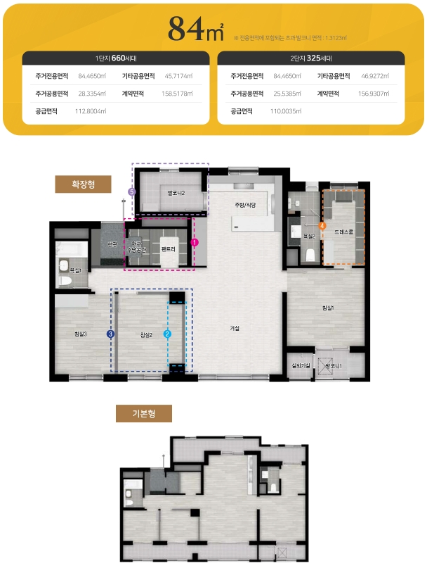 평면 정보 중 84 타입의 경우는 1단지와 2단지 모두 같은 형태로 되어 있는 것을 볼수 있고 대부분 타입이 4Bay 판상형 구조로 되어 있거 개방감 좋고 공간 활용을 효율적으로 이용할수 있도록 설계되어 있는것을 볼 수가 있습니다. 타입별로 동호수 배치에 신경 써서 살펴보시기 바랍니다.