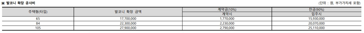발코니 확장 비용은 타입별로 17,700,000원 ~ 27,900,000원이니 분양가 산정 시 참고하시기 바랍니다.