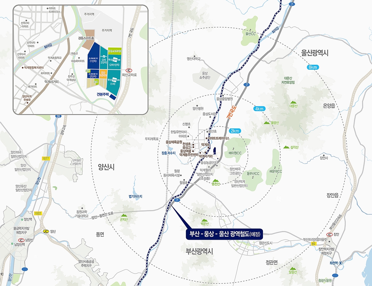 7번 국도로 부산과 울산을 가깝게 이용할 수 있는 지역으로 부산-웅산-울산 광역철도 개통 예정으로 프리미엄이 기대되는 지역입니다. 단지 내에 회야초등학교, 웅상중, 웅상여중, 웅상고 등 자녀 안심 학군 형성되어서 어른도 아이도 모두 편리한 입지 조건 완성되었습니다. 양산의 중심에 위치한 단지라 각종 생활 인프라까지 잘 형성되어 있어서 입주부터 편리한 생활이 가능할 것으로 보입니다.