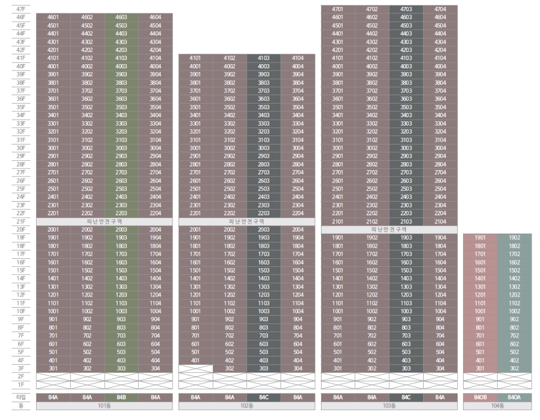 아파트는 47층까지 구성되어 있고 오피스텔은 19층까지 구성되어 있습니다. 같은 동이라도 타입이 약간씩 다를수가 있다는 점도 참고 사항입니다.