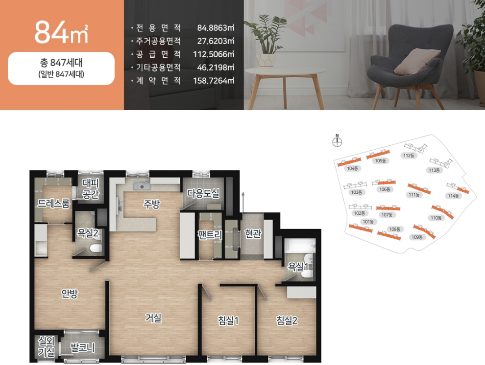 가장 많은 세대수가 있고 수요 역시 가장 많을 것으로 예상되는 84 타입은 4Bay 구조로 개방감 좋고 채광도 확보가 되어 있습니다. 안방에는 드레스룸이 기억자로 자리 잡을 수가 있고 파우더룸도 확보가 될 듯합니다. 주방은 많은 사람들이 선호하는 디귿자 구조로 되어 있고 팬트리 공간도 넓고 거실 및 방들도 넓어서 4인 가족이나 그 이상도 여유 있게 거주할 수 있는 조건 형성되었습니다.