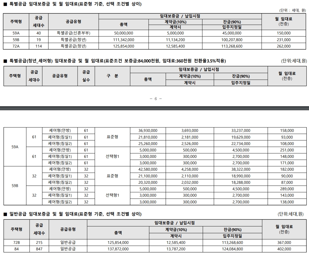 여기서 특징적인 것은 특별공급과 일반공급의 임대보증금 및 월 임대료가 다르다는 것인데요 어떠한 방법으로 청약을 하실 것인지에 따라서 달라질 수 있으니 꼭 확인하시고요 셰어형의 경우는 어떤 방을 선택하느냐에 따라서 보증금 및 임대료가 달라진다는 점도 참고하시기 바랍니다.