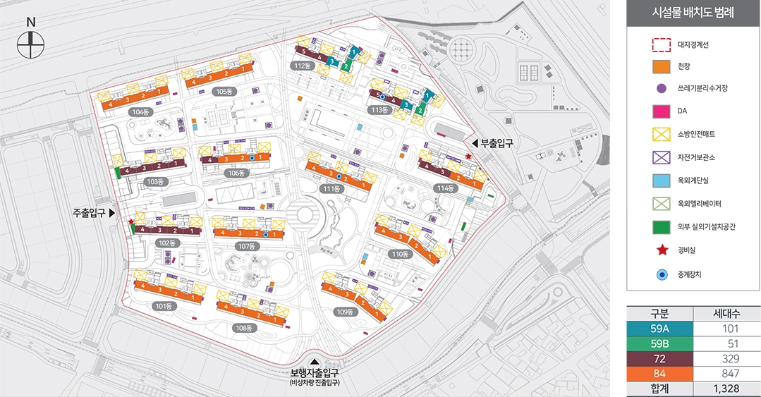 단지는 남향 위주로 설계하였고 동간 간섭을 최소화 하기 위해서 설계한 모습을 볼 수가 있습니다. 주차장은 지하로 내려가고 지상은 공원 및 산책로 조성한 것이 특징적으로 보이는데요 요즘 많이 유행하는 기억자 구조가 아닌 일자형 구조로 설계한 것도 특징 중에 하나입니다.
