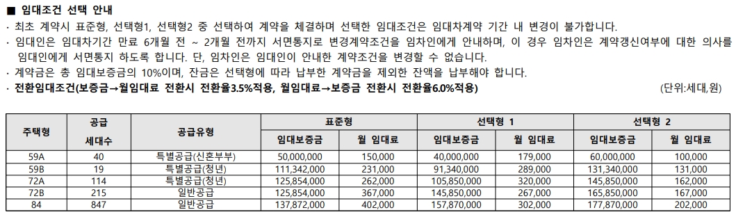공공지원 민간임대주택이다 보니 주변 대비 임대료가 70% 저렴한 수준에서 책정될 것인데요 평택역 SK VIEW 아파트는 임대료 비율에 따라서 총 3가지 임대 조건이 제공됩니다. 자신의 상황에 맞춰서 보증금과 임대료를 선택할 수가 있는데요 자세하게 알아보겠습니다.