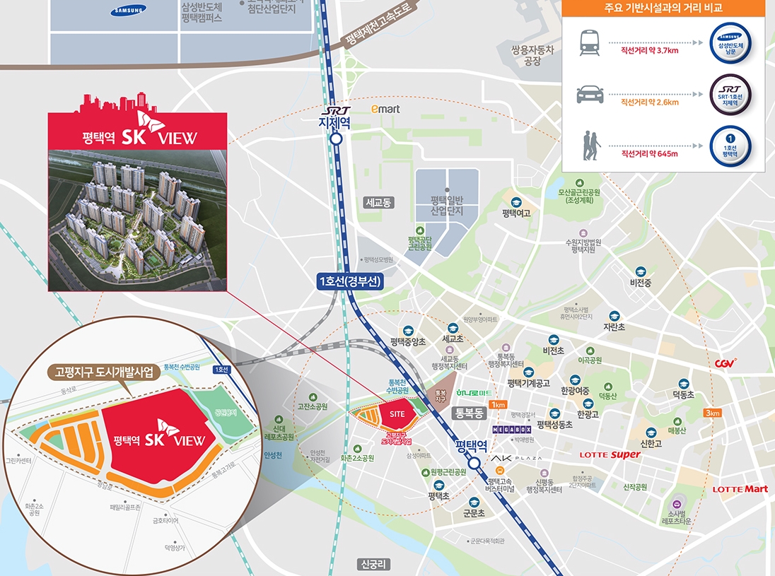 평택역 SK VIEW 아파트는 평택역과 인접하여 있고 단지 주면 초, 중, 고 형성으로 자녀 안심교육 가능하며, AK백화점, 롯데마트, 메가박스 등 쇼핑 및 문화 즐기기에 충분한 입지 조건 가지고 있습니다. 평택 일반 산업 단지와 삼성반도체와 가까운 위치에 있어서 직주 접근 원하시는 분들에게는 아주 좋은 입지 조건이라 할 수 있겠습니다.