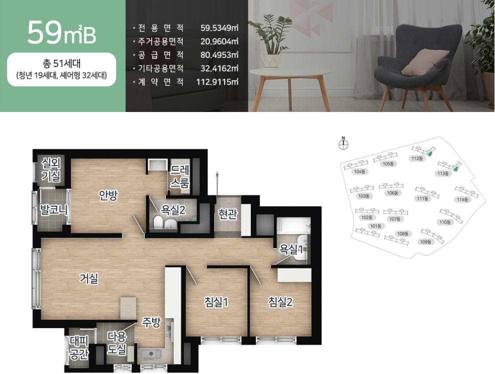 59A, B 타입은 방 3개 화장실 2개 구조로 주방 옆에 다용도실이 존재하고 거실 및 방들이 크게 설계되었다는 것이 특징입니다. 주방은 기억자 구조로 되어 있고 식탁 자리도 넉넉하게 구성되어 있는데요 A타입보다는 B타입이 많은 사람들이 선호할 것 같은 구조로 설계되었습니다.