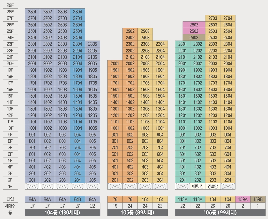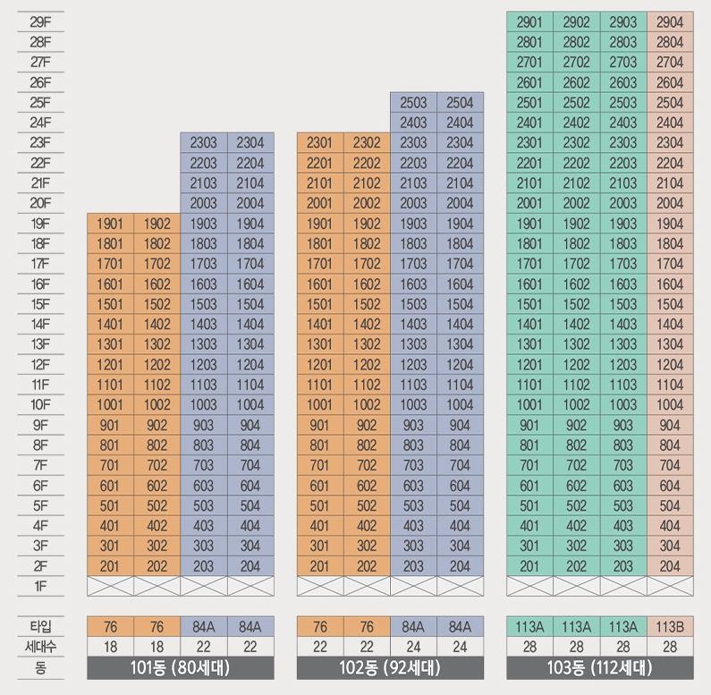 다양한 타입이 골고루 배치된 모습 볼수 있는 배치도는 가장 많은 분양세대가 있는 84A타입이 어느 동에 있는지 유심히 살펴보실 필요가 잇을것 같습니다. 같은 동에서도 남서향과 남동향이 존재 하기 때문에 라인별로 어느 동이 좋을지도 고민 하셔야 할 문제 입니다.