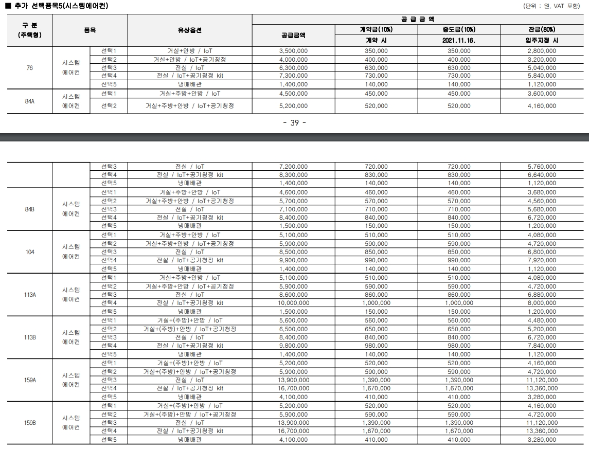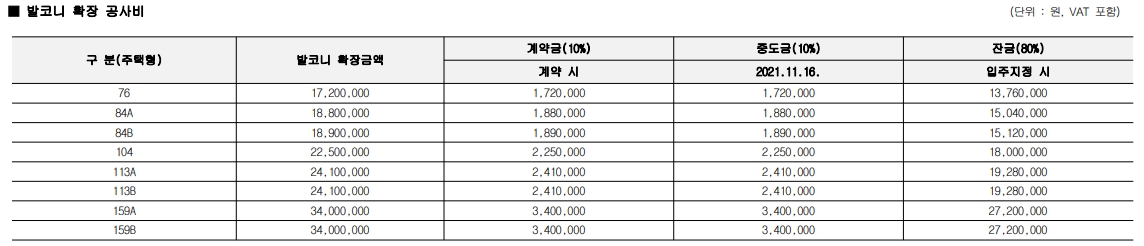 분양가 산정시 발코니 확장형 선택하시는 분들은 꼭 발코니 확장 비용을 고려해서 분양가 산정하시기 바랍니다. 각 타입별로 17,200,000원 부터 34,000,000원 까지 분포 되어 있기 때문에 자신이 원하는 타입의 발코니 확장 비용 확인 하시기 바랍니다.