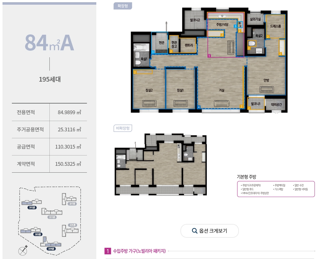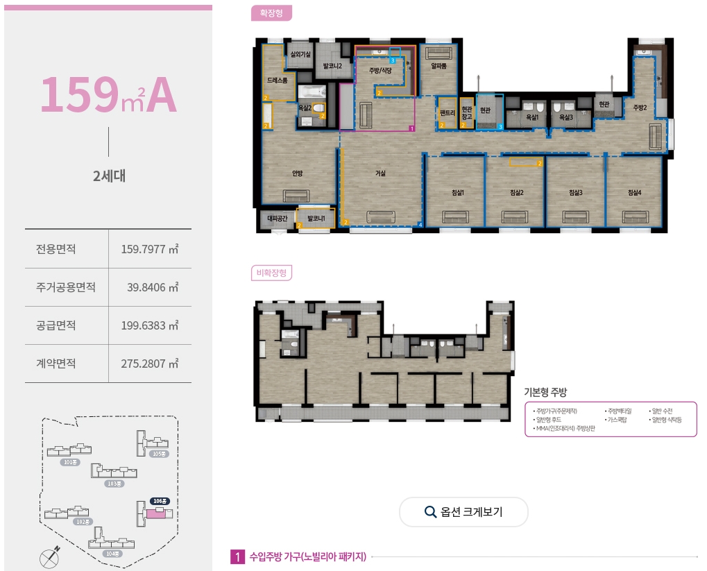 대부분 4Bay 판상형 구조로 설계한 모습으로 개방감과 공간효율을 동시에 만족하는 모습 볼수가 있었습니다. 현관옆 창고 위치하여 수납이 너무나 편리하고 모든 타입에서 주방 옆 발코니 위치하여 공간 활용에 너무나 유리하게 설계되어 있습니다. 펜트리 공간까지 완벽하여 공간을 알차게 구성한 모습 볼수가 있었습니다.