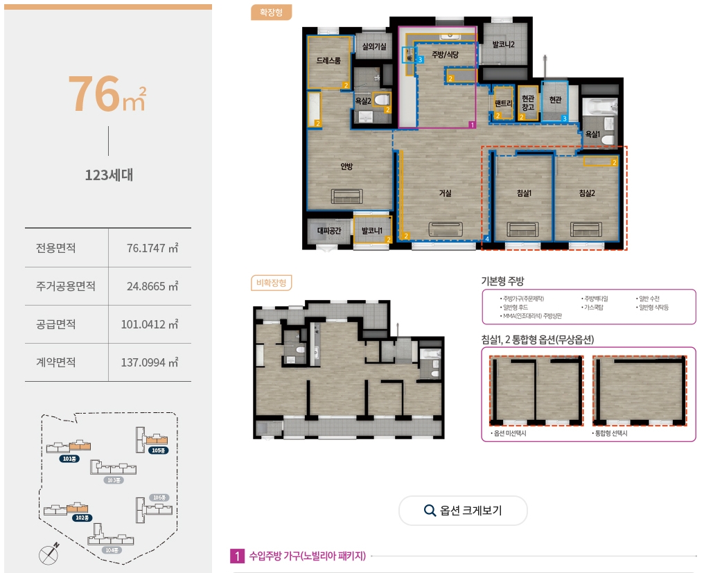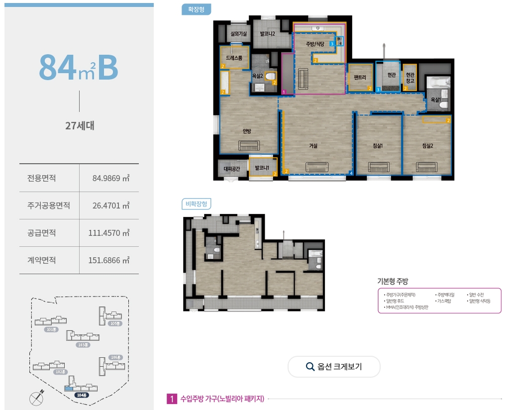 한화 포레나 천안신부 아파트 평면도 발코니 확장 비용 옵션 평명도