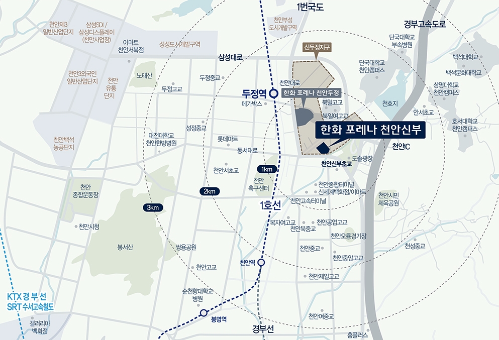 지하철 1호선 두정역을 이용하여 서울로 출퇴근이 가능한 한화 포레나 천안신부 아파트는 단지 주변 신세계백화점, 이마트, 메가박스, 롯데마트 등 다양한 쇼핑 인프라 구축되어 있고 초, 중, 고등학교 역시 단지와 가까운 곳에 위치해 자녀 안심 학군 형성되어 있습니다. 단지 주변 산책로와 공원도 형성되어 있어 몸도 마음도 편안하게 이용가능한 입지 조건 형성되어 있습니다.