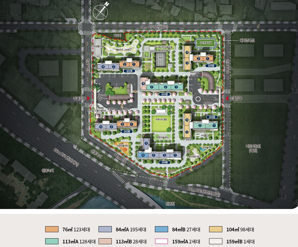 6개 동이 서로 간섭 되지 않도록 효율적으로 동 배치 하였고 채광에 유리하도록 남동향과 남서향을 적절하게 배치한 모습 볼수 있습니다. 출입구를 2곳으로 분산해 교통혼잡 최소화 하였고 주민 편의 시설까지 적절하게 배치하여 안정적인 생활 가능 하도록 도와주는 설계 센스 볼수 있었습니다.