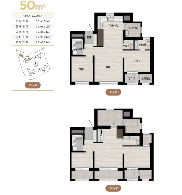 가장 작은 사이즈인 50㎡은 방 2개 화장실 하나 구조이지만 안방에 드레스룸과 주방 쪽 팬트리 공간 및 다용도실 연결로 인해서 공간 활용이 너무나 깔끔하게 구성되어 있는것이 특징입니다. 3 Bay로 구성되어 있는 공간은 작은 사이즈이지만 넓게 보이는 효과까지 얻을 수가 있습니다.