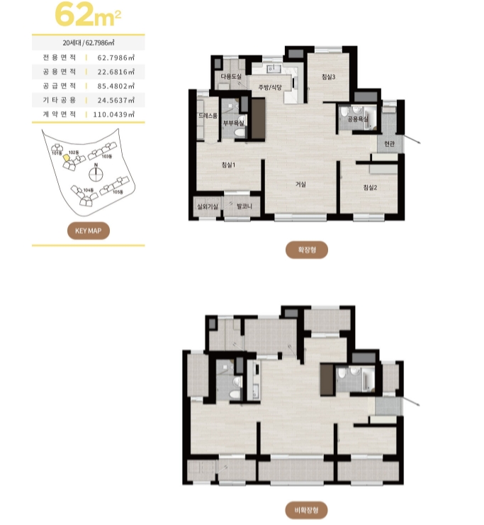안방 드레스룸이 인상적인 62㎡ 타입은 방 3개 화장실 2개로 구성되어 있어서 3인 이상 가족이나 신혼부부 거주하시면 방을 업무공간이나 공부방으로 효과적으로 사용할 수 있다는 장점 엿볼 수가 있었습니다. 대부분 타입에서 주방 옆 다용도실 위치되게 설계하여 공간 활용을 많이 신경 쓴 설계 확인할 수가 있었습니다.