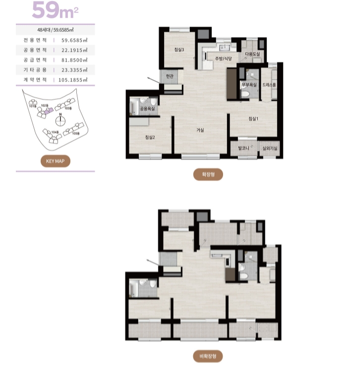 방 3개 화장실 2개인 59㎡ 타입 역시 공간 활용도 우수해서 다양한 인테리어 볼 수가 있을 것으로 예상되고 안방에 부부욕실 존재만으로도 활용하기에 너무나 좋은 공간 형성되어 있는 것을 느낄 수가 있었습니다.