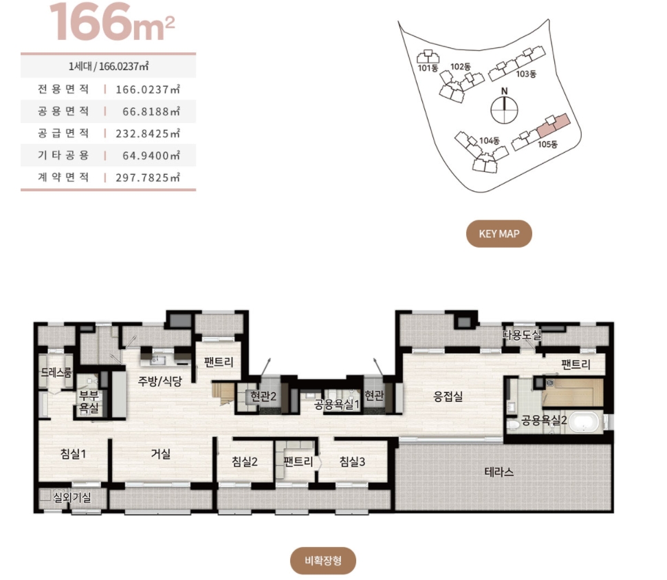 단 1세대 밖에 없는 팬트하우스라 불릴 수 있는 166㎡ 타입은 테라스까지 존재하기 때문에 모든 사람들의 로망이라고 해도 과언이 아닐 정도의 위용을 보여주는데요 방 4개 화장실 2개의 공간과 응접실까지 완벽하고 현관이 2개 있다는 것이 특징 중에 하나라고 볼 수 있습니다. 사이즈가 상당하다는 것 역시 특징 중에 하나이 군요