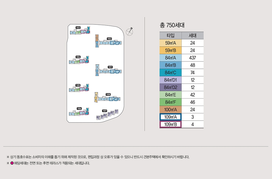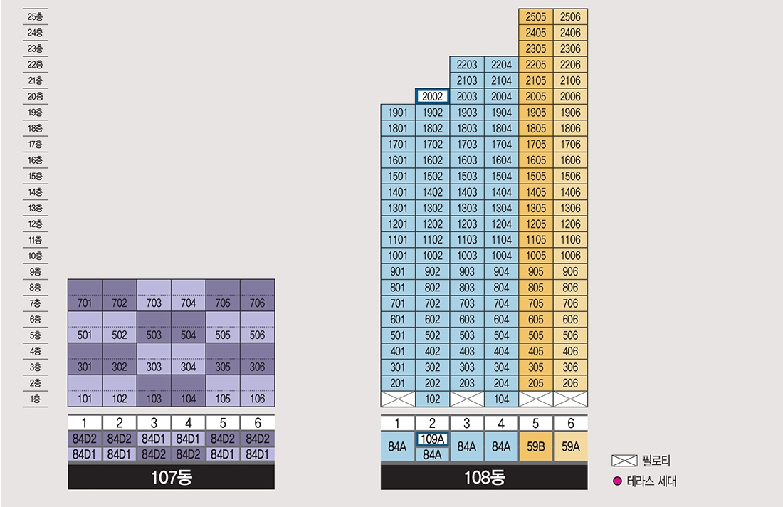 다양한 타입이 존제 하지만 가장 많은 수를 차지 하는 84A 타입의 분포가 눈에 띄구요 최상층 펜트하우스 7세대가 특징적으로 다가올수가 있습니다.