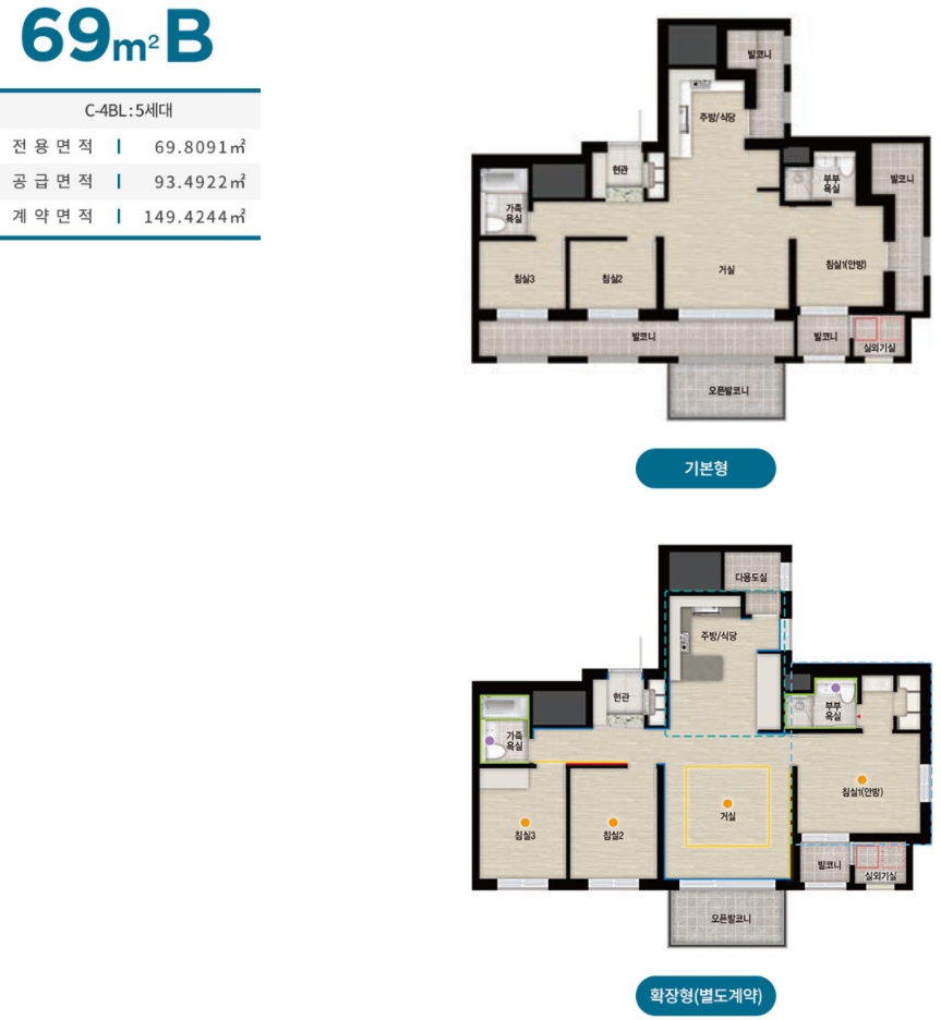 69 A, B 타입은 62 타입과 비슷한 형태를 띄고 있고 특징적인것은 특정호수에 오픈발코니가 존재한다는 것입니다. 더욱 넓은 세대를 원하시는 분들은 69타입이 좋은 선택이 될것 같습니다.