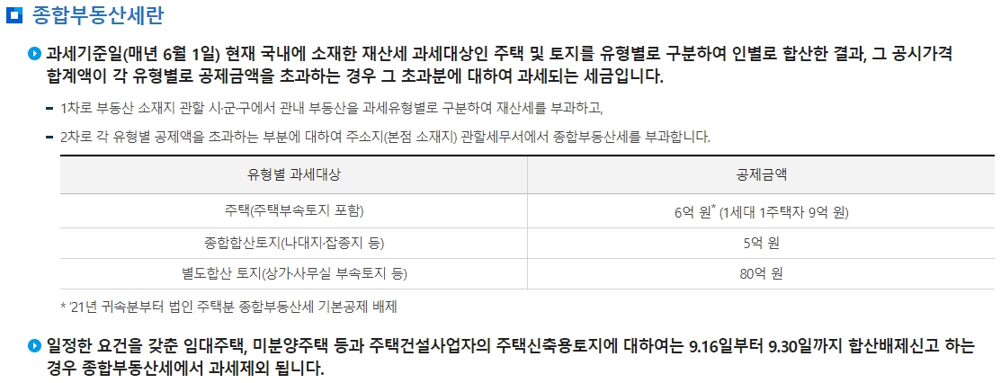 종합부동산세는 재산세 과세기준일인 매년 6월 1일 현재 보유한 과세유형별 공시가격의 전국 합산액이 공제 금액을 초과하는 재산세 납세의무자에게 부과되는 세금입니다.