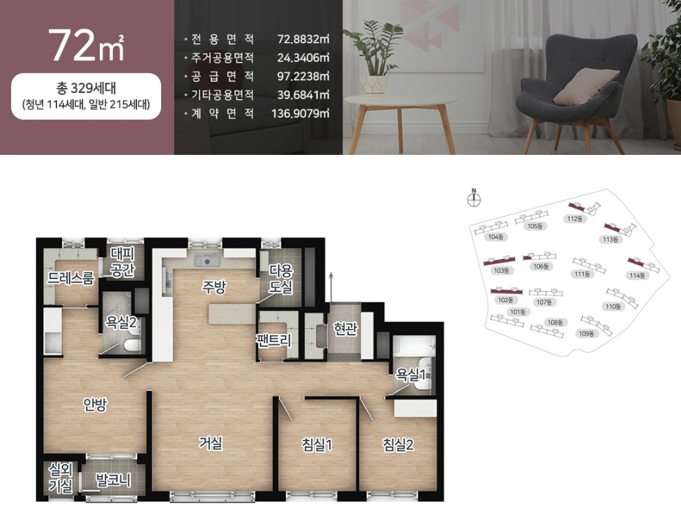 72 타입은 4Bay 구조로 방3개 화장실 2개 구조로 되어 있습니다. 안방에는 넓은 드레스룸이 인상적인데요 주방 역시 주부님들이 좋아하는 구조로 설계가 되었고 모든 방에 채광을 고려한 설계가 눈에 띄는 구조 입니다. 주방쪽 팬트리 공간은 다양한 수납을 도와줄것으로 예상됩니다.