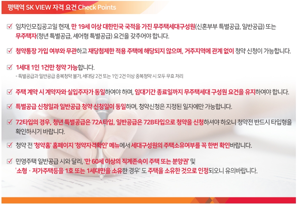 평택역 SK VIEW 아파트는 공공지원 민간임대아파트 이기 땜누에 신청자격 요건이 존재하는데요 청약하시기 전에 꼭 자신이 자격요건에 해당하는지 알아보시고 진행하시기 바랍니다.